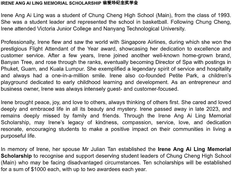 Irene Ang Ai Ling Scholarship at Chung Cheng